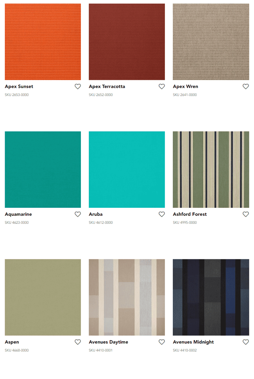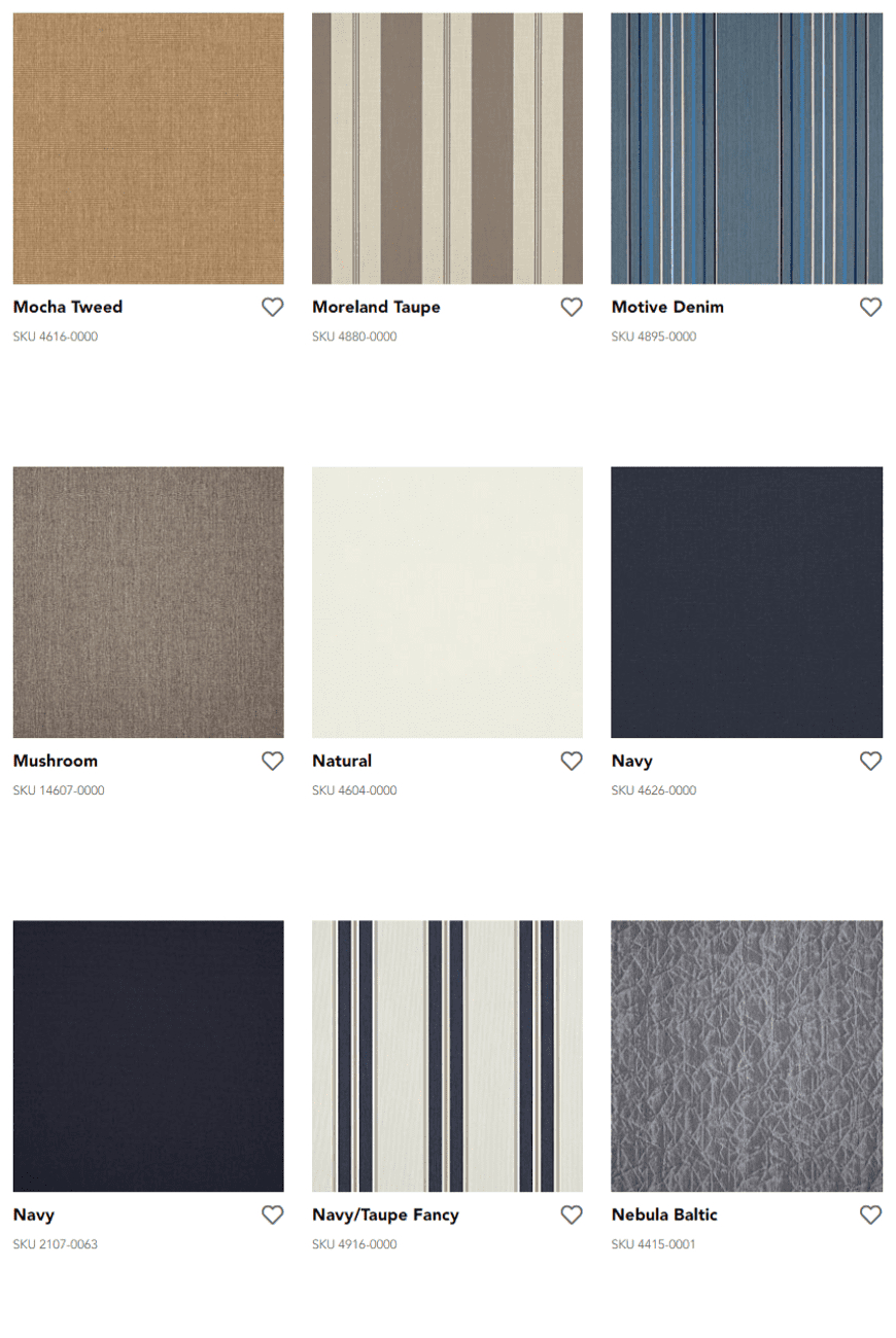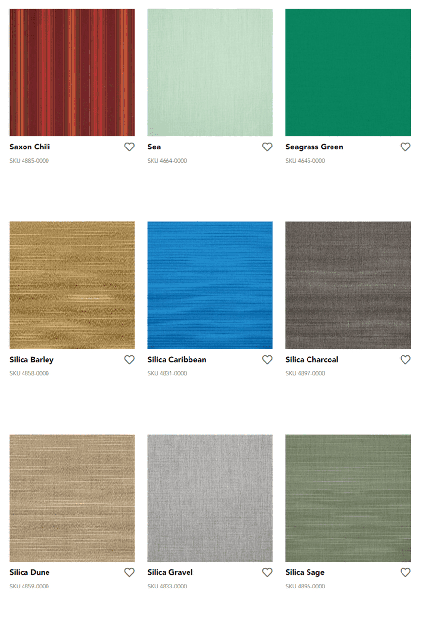Durable Sunbrella fibers are saturated to the core with color and UV stabilized pigments, ensuring our fabrics won’t fade or become damaged due to the sun’s harsh rays or normal wear. Sunbrella fabrics, unlike ordinary fabrics, are solution-dyed with rich colors that stay brilliant over time no matter the environment.